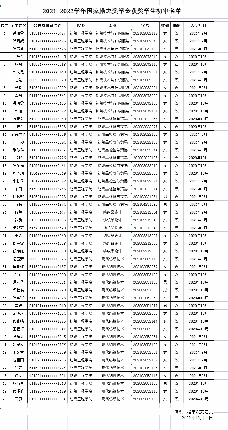 根据《四川省教育厅关于做好2022年高校国家奖助学金评审工作的通知》的有关规定,经学生本人申请,班级资助评议小组评议,学院学生资助工作领导小组、学院党政联席会议审核通过,现将学院国家励志奖学金获奖学生初审名单公示如下图,公示期为2022年10月14日—2022年10月16日,公示期如有异议,请及时向学院党总支及学院学生资助工作领导小组实名或当面反映。