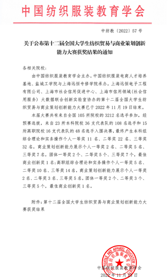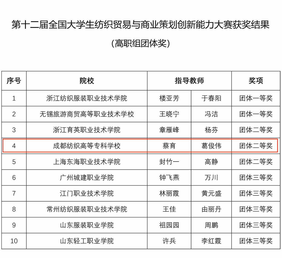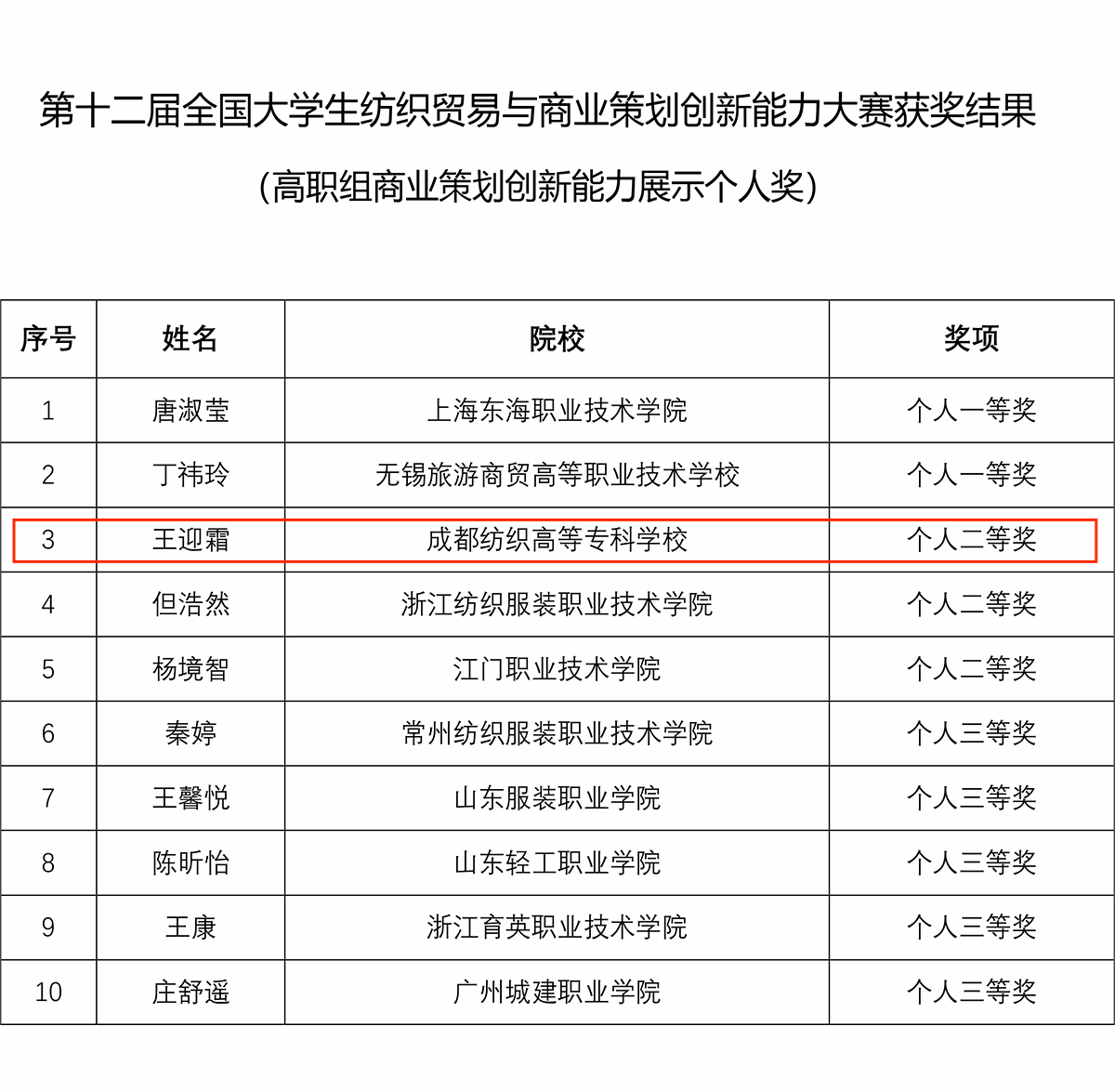 11月19日,为期一月的第十二届全国大学生纺织贸易与商业策划创新能力大赛圆满落幕。23日,赛果宣布。由我校必赢766net手机版教师蔡育、葛俊伟指导的学生蹇宇宏、周敏、王艳梅分获高职组综合理论和实务操作个人一、二、三等奖,王迎霜获得高职组商业策划创新能力展示个人二等奖,整个团队获得高职组团体二等奖。