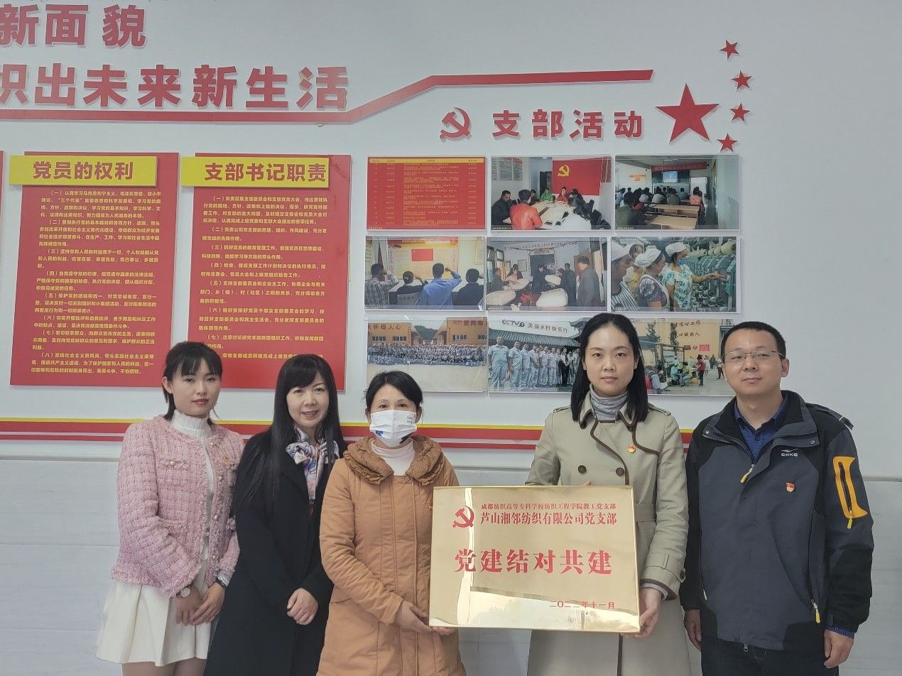 在结对共建活动上,教工党支部与芦山湘邻纺织有限公司党支部签订共建协议,并向公司党支部颁发“党建结对共建”牌匾。双方围绕“党建引领、校企融合”这一党建活动新模式,旨在充分发挥基层党组织党建的核心引领作用,在平等、互利、合作、共赢的基础上,实现校企党组织优势互补。双方探讨了党员队伍建设,整合校企双方在党建、大学生就业创业、人才培养、人才招聘、技术服务、产学研工作等方面的资源优势,积极探索党建共建新模式,充分发挥党支部战斗堡垒作用和党员先锋模范作用,深化党支部标准化规范化建设。