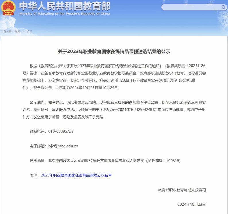 关于2023年职业教育国家在线精品课程遴选的公示