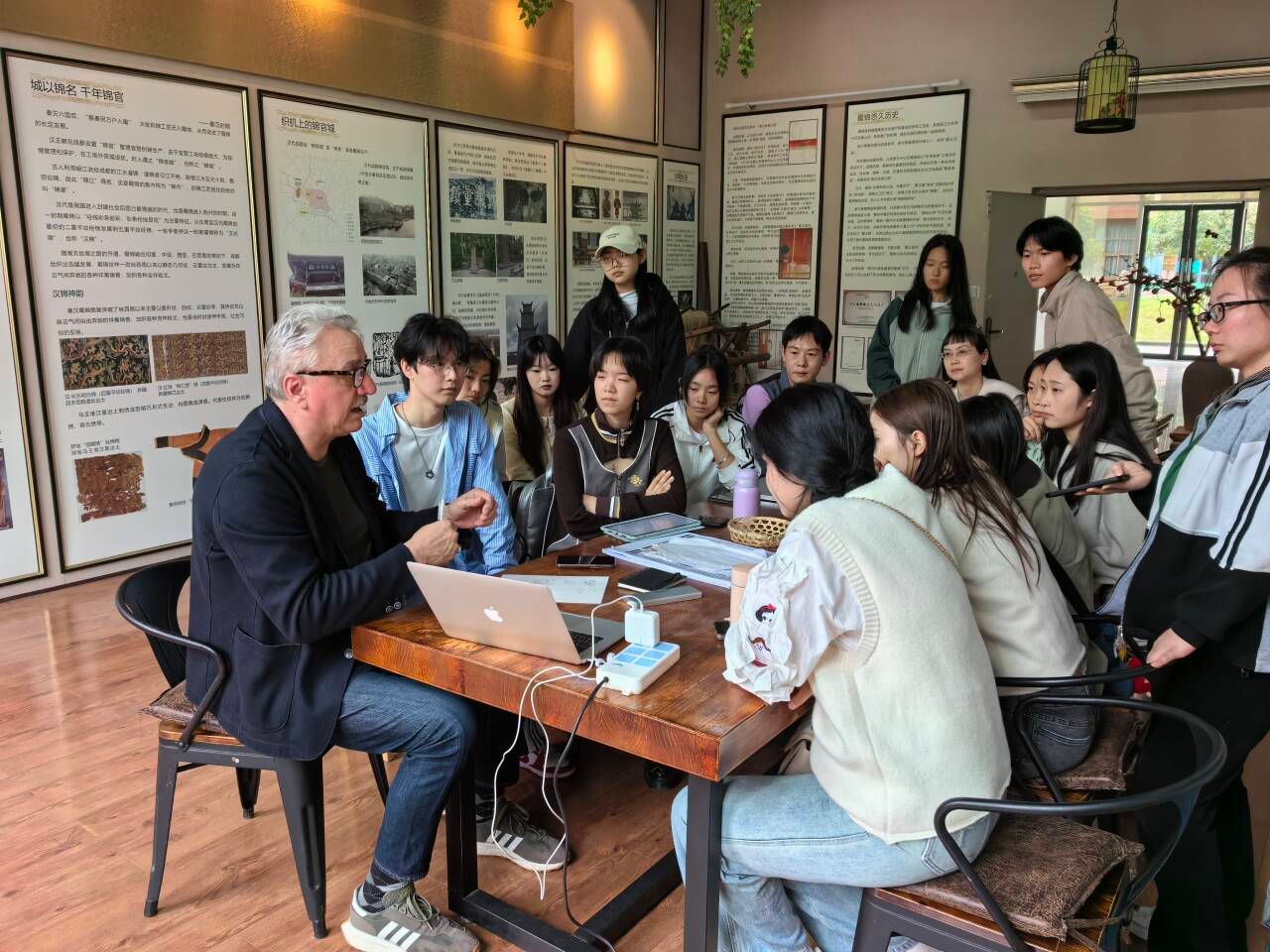 在马西姆老师的精心指导下,项目团队首先深入探讨了蜀锦蜀绣的悠久历史、精湛工艺及深厚文化内涵,充分领略其独特魅力。随后,马西姆老师为学生们介绍了国际前沿的现代设计理念和流行趋势,并为他们提供了丰富的创意灵感和设计思路。在设计实践中,学生们充分发挥了想象力和创造力,从图案构成、材料选择到工艺手段等方面均进行了大胆的创新尝试。