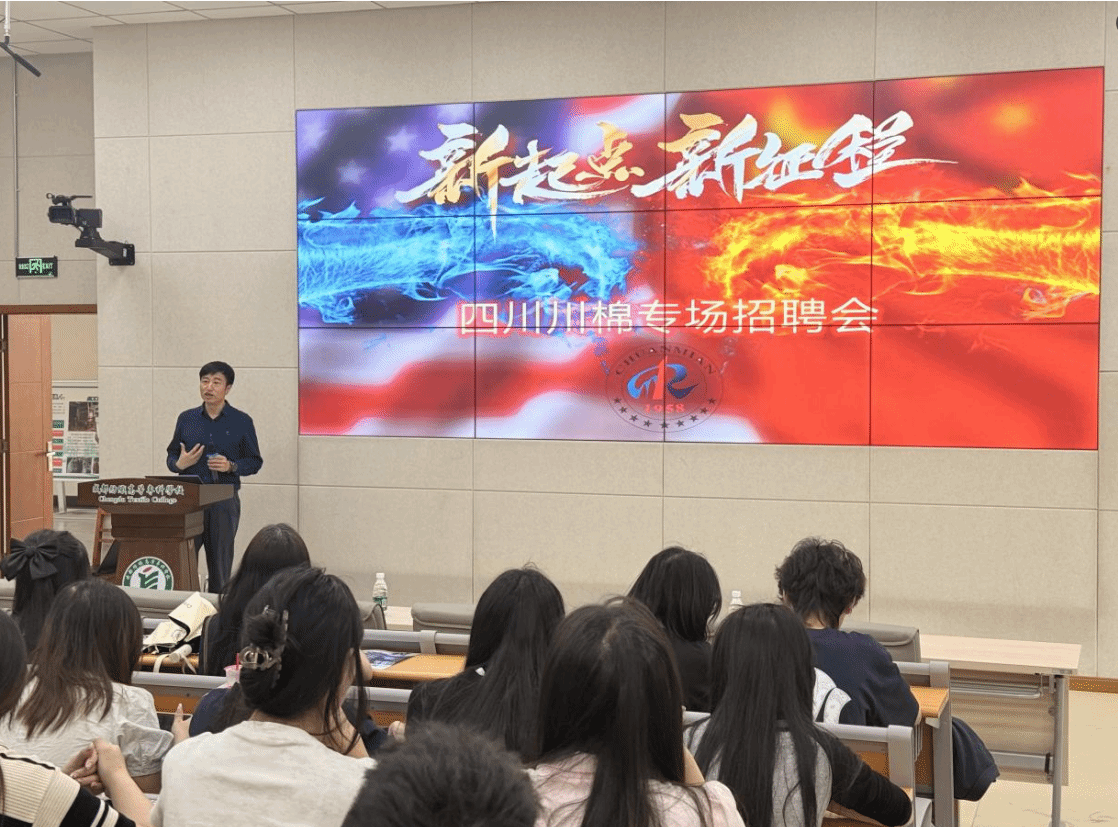 4月16日下午,四川川棉印染制品有限公司在明德楼X1114进行了专场招聘宣讲,企业总经理余留贵向到场同学介绍了企业概况及发展历程,并结合个人职业经验解析行业动态,鼓励同学们积极投身纺织行业。