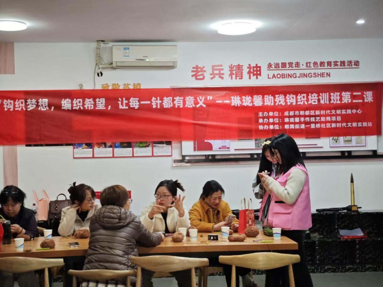 3月23日,成都市郫都区一里桥社区新时代文明实践站内,五彩毛线与欢声笑语交织成春日暖阳。"琳珑馨"助残钩织课程培训班第二期正式开课了,十余名残障人士、家庭妇女在助残志愿服务团队的指导下,以指尖艺术继续编织生活新希望。